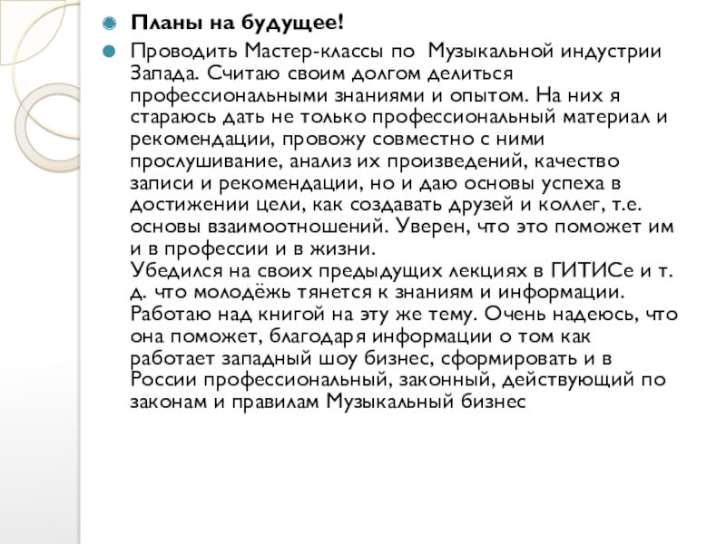 Проводить Мастер-классы по Музыкальной индустрии Запада. Считаю своим долгом