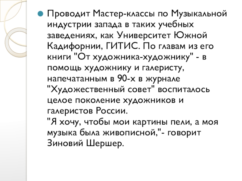 Слайд 11Проводит Мастер-классы по Музыкальной индустрии запада в таких учебных заведениях, как