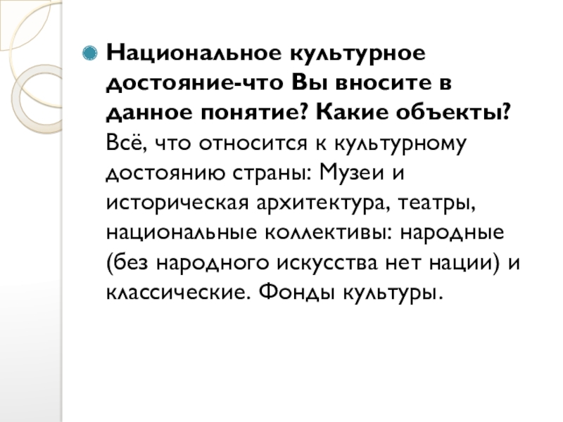 Слайд 13Национальное культурное достояние-что Вы вносите в данное понятие? Какие объекты?