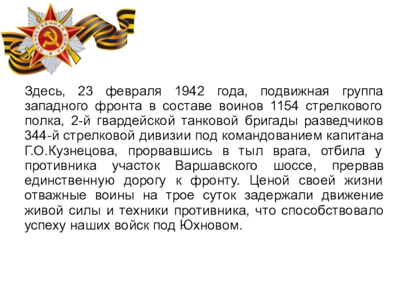 Слайд 26Здесь, 23 февраля 1942 года, подвижная группа западного фронта в составе