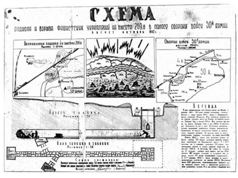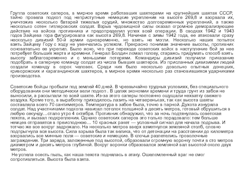СССР, тайно провела подкоп под неприступные немецкие укрепления на высоте 269,8 и взорвала их, уничтожив несколько батарей тяжелых орудий, множество долговременных укреплений, а также несколько сотен гитлеровских солдат. Взрыв чудовищной силы оказал огромное деморализующее действие на войска противника и предопределил успех всей операции. В сводках 1942 и 1943 годов Зайцева гора фигурировала как высота 269,8. Начиная с зимы 1942 года, ее атаковали сразу несколько дивизий 50-й армии одновременно, но взять не могли. Несколько наших попыток взять Зайцеву Гору с ходу не увенчались успехом. Прекрасно понимая значение высоты, противник основательно ее укрепил. Было ясно, что при переходе советских войск в наступление бой за нее потребует больших жертв и времени. Генерал Болдин ломал голову, стараясь придумать способ взять высоту заблаговременно и с меньшими потерями. Командиры дивизий получили приказание подобрать в саперную команду солдат из числа бывших шахтеров. Из присланных дивизиями людей создали команду в сорок человек. Среди них было несколько довольно опытных донецких, криворожских и карагандинских шахтеров, в мирное время несколько раз становившихся ударниками производства.