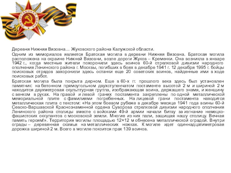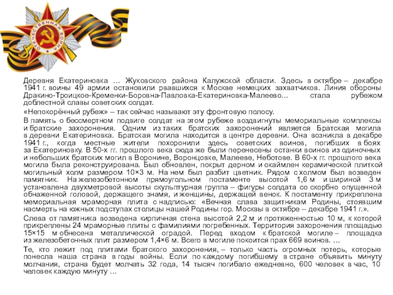 Слайд 105Деревня Екатериновка … Жуковского района Калужской области. Здесь в октябре – декабре 1941 г. воины