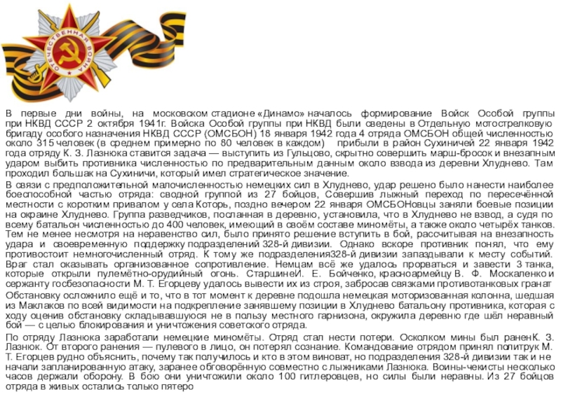 Слайд 50В первые дни войны, на московском стадионе «Динамо» началось формирование Войск Особой группы при НКВД СССР