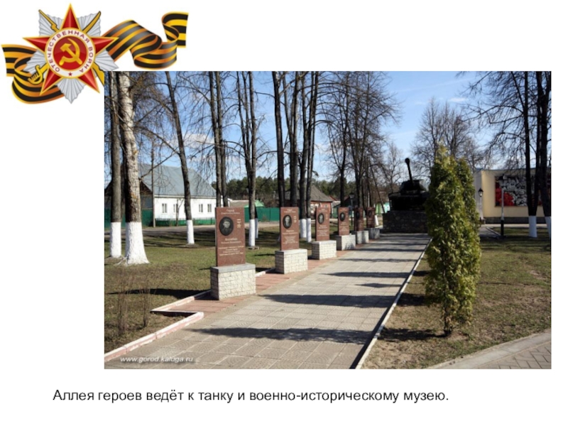 Слайд 44Аллея героев ведёт к танку и военно-историческому музею.