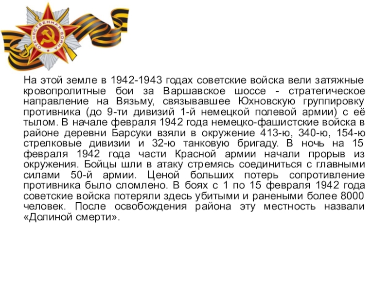 Слайд 32На этой земле в 1942-1943 годах советские войска вели затяжные кровопролитные