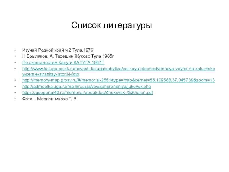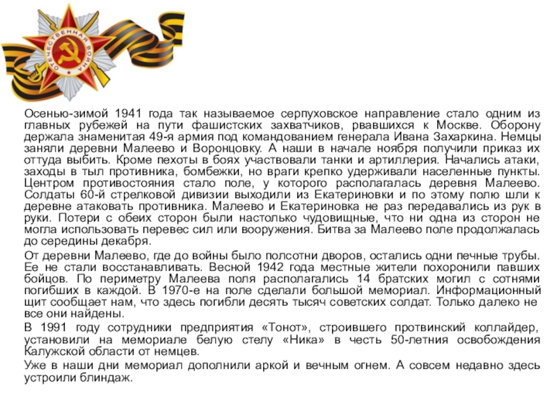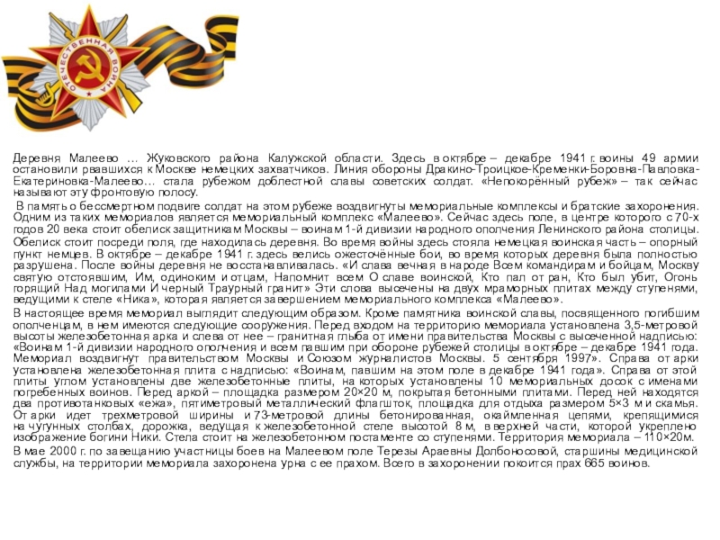 Слайд 94Деревня Малеево … Жуковского района Калужской области. Здесь в октябре – декабре 1941 г. воины