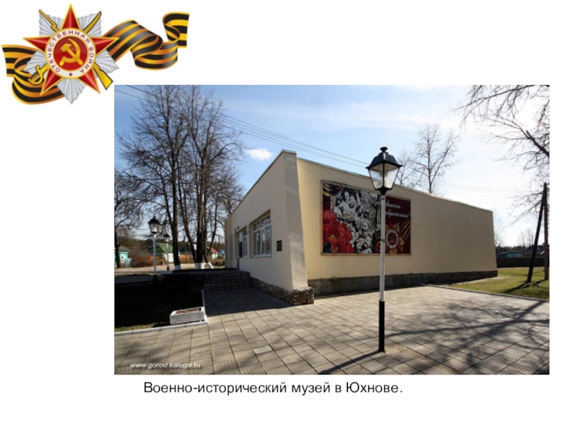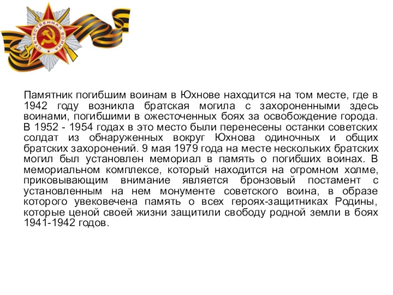 Слайд 43Памятник погибшим воинам в Юхнове находится на том месте, где в