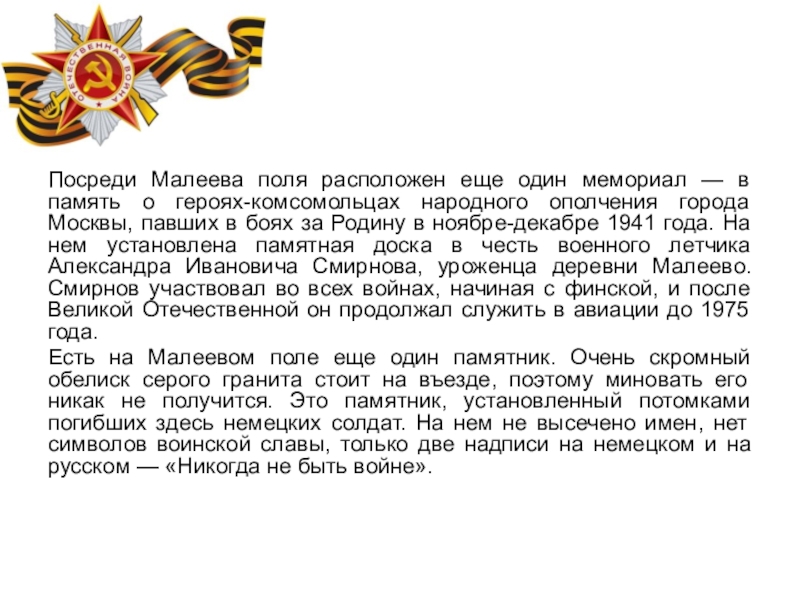 Слайд 97Посреди Малеева поля расположен еще один мемориал — в память о
