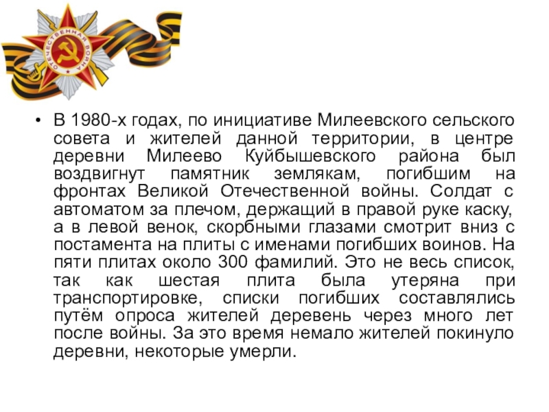 Слайд 20В 1980-х годах, по инициативе Милеевского сельского совета и жителей данной