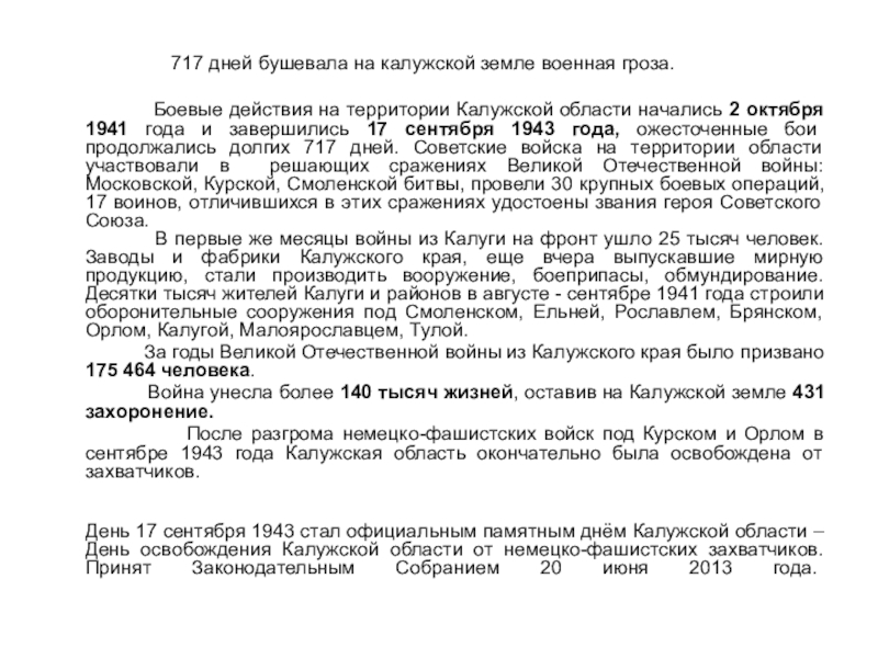 Боевые действия на территории Калужской области начались 2 октября 1941 года и завершились 17 сентября 1943 года, ожесточенные бои продолжались долгих 717 дней. Советские войска на территории области участвовали в решающих сражениях Великой Отечественной войны: Московской, Курской, Смоленской битвы, провели 30 крупных боевых операций, 17 воинов, отличившихся в этих сражениях удостоены звания героя Советского Союза.
