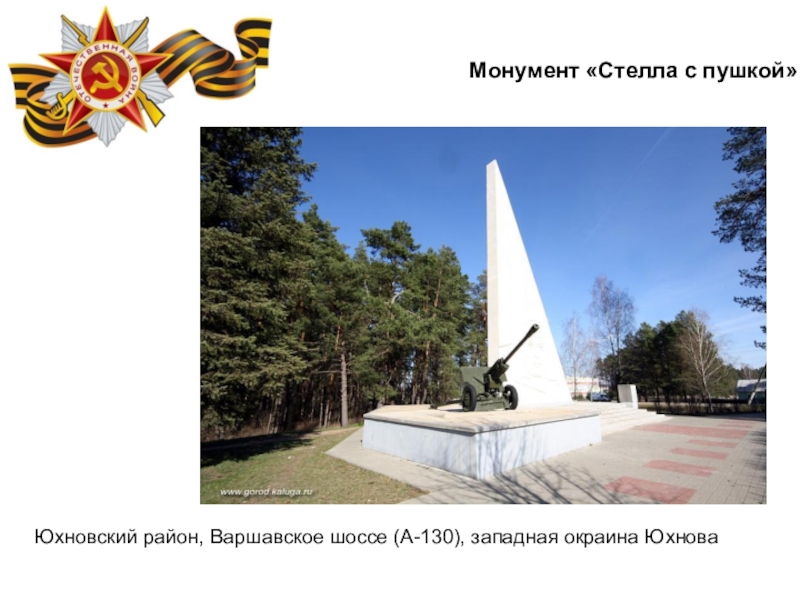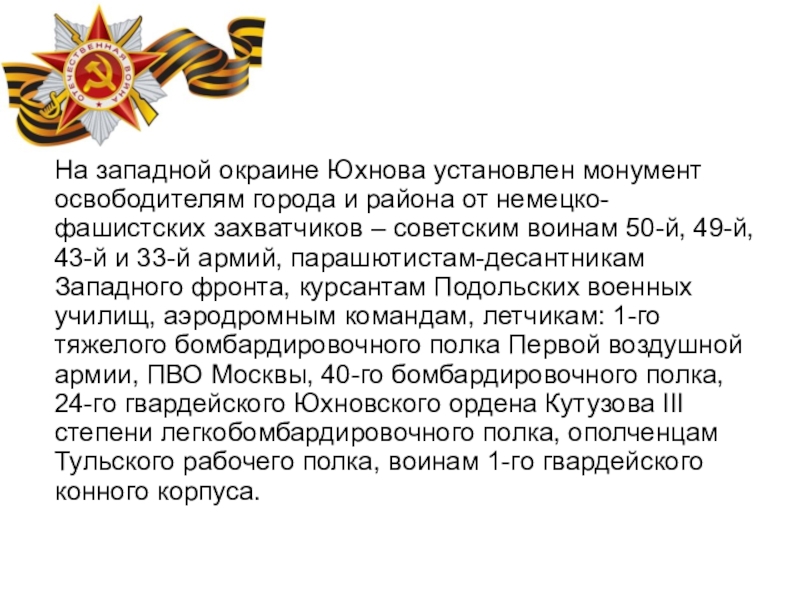 Слайд 41На западной окраине Юхнова установлен монумент освободителям города и района от