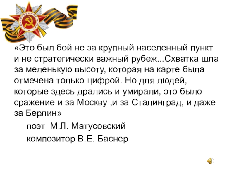 важный рубеж...Схватка шла за меленькую высоту, которая на карте была отмечена только цифрой. Но для людей, которые здесь дрались и умирали, это было сражение и за Москву ,и за Сталинград, и даже за Берлин»
