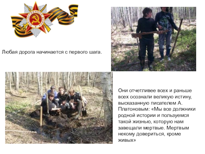 всех осознали великую истину, высказанную писателем А. Платоновым: «Мы все должники родной истории и пользуемся такой жизнью, которую нам завещали мертвые. Мертвым некому довериться, кроме живых»