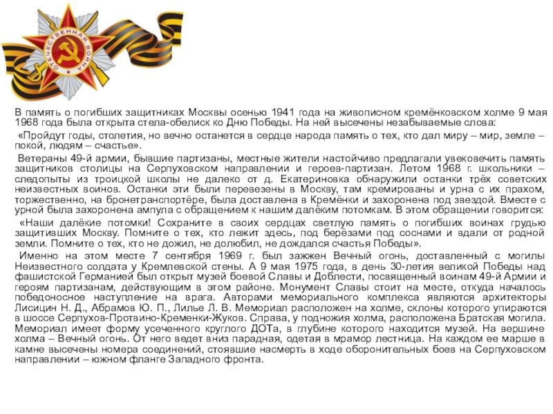 Именно на этом месте 7 сентября 1969 г. был зажжен Вечный огонь, доставленный с могилы Неизвестного солдата у Кремлевской стены. А 9 мая 1975 года, в день 30-летия великой Победы над фашистской Германией был открыт музей боевой Славы и Доблести, посвященный воинам 49-й Армии и героям партизанам, действующим в этом районе. Монумент Славы стоит на месте, откуда началось победоносное наступление на врага. Авторами мемориального комплекса являются архитекторы Лисицин Н. Д., Абрамов Ю. П., Лилье Л. В. Мемориал расположен на холме, склоны которого упираются в шоссе Серпухов-Протвино-Кременки-Жуков. Справа, у подножия холма, расположена Братская могила. Мемориал имеет форму усеченного круглого ДОТа, в глубине которого находится музей. На вершине холма – Вечный огонь. От него ведет вниз парадная, одетая в мрамор лестница. На каждом ее марше в камне высечены номера соединений, стоявшие насмерть в ходе оборонительных боев на Серпуховском направлении – южном фланге Западного фронта.