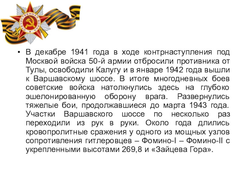 армии отбросили противника от Тулы, освободили Калугу и в январе 1942 года вышли к Варшавскому шоссе. В итоге многодневных боев советские войска натолкнулись здесь на глубоко эшелонированную оборону врага. Развернулись тяжелые бои, продолжавшиеся до марта 1943 года. Участки Варшавского шоссе по несколько раз переходили из рук в руки. Около года длились кровопролитные сражения у одного из мощных узлов сопротивления гитлеровцев – Фомино-I – Фомино-II с укрепленными высотами 269,8 и «Зайцева Гора».