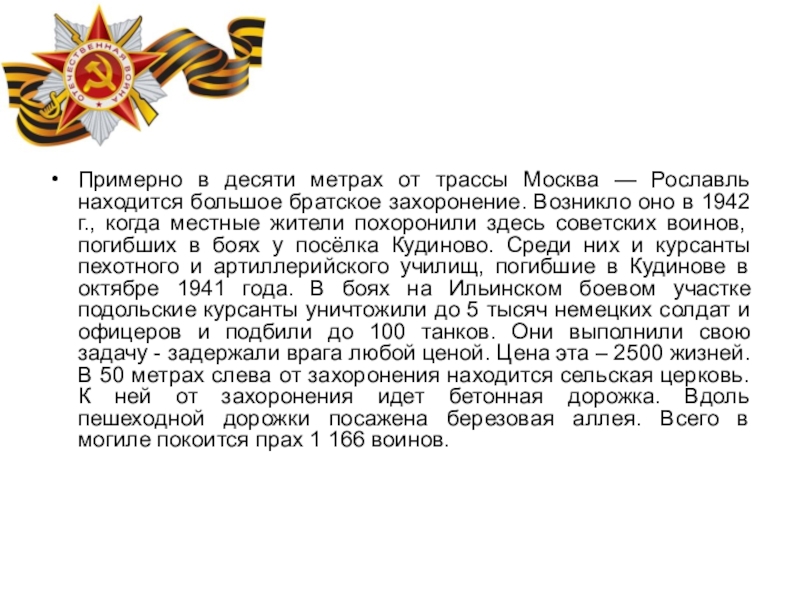 братское захоронение. Возникло оно в 1942 г., когда местные жители похоронили здесь советских воинов, погибших в боях у посёлка Кудиново. Среди них и курсанты пехотного и артиллерийского училищ, погибшие в Кудинове в октябре 1941 года. В боях на Ильинском боевом участке подольские курсанты уничтожили до 5 тысяч немецких солдат и офицеров и подбили до 100 танков. Они выполнили свою задачу - задержали врага любой ценой. Цена эта – 2500 жизней. В 50 метрах слева от захоронения находится сельская церковь. К ней от захоронения идет бетонная дорожка. Вдоль пешеходной дорожки посажена березовая аллея. Всего в могиле покоится прах 1 166 воинов.