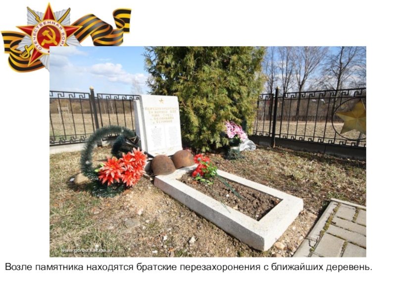 Слайд 35Возле памятника находятся братские перезахоронения с ближайших деревень.