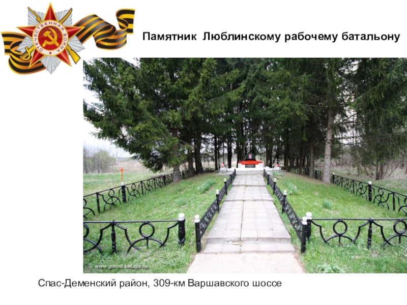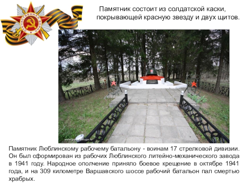 Памятник Люблинскому рабочему батальону - воинам 17 стрелковой дивизии. Он был сформирован из рабочих Люблинского литейно-механического завода в 1941 году. Народное ополчение приняло боевое крещение в октябре 1941 года, и на 309 километре Варшавского шоссе рабочий батальон пал смертью храбрых.