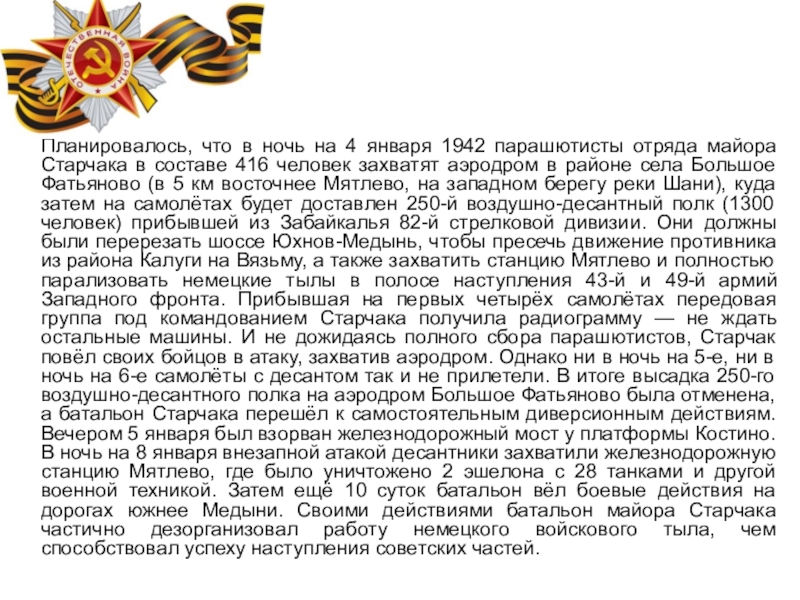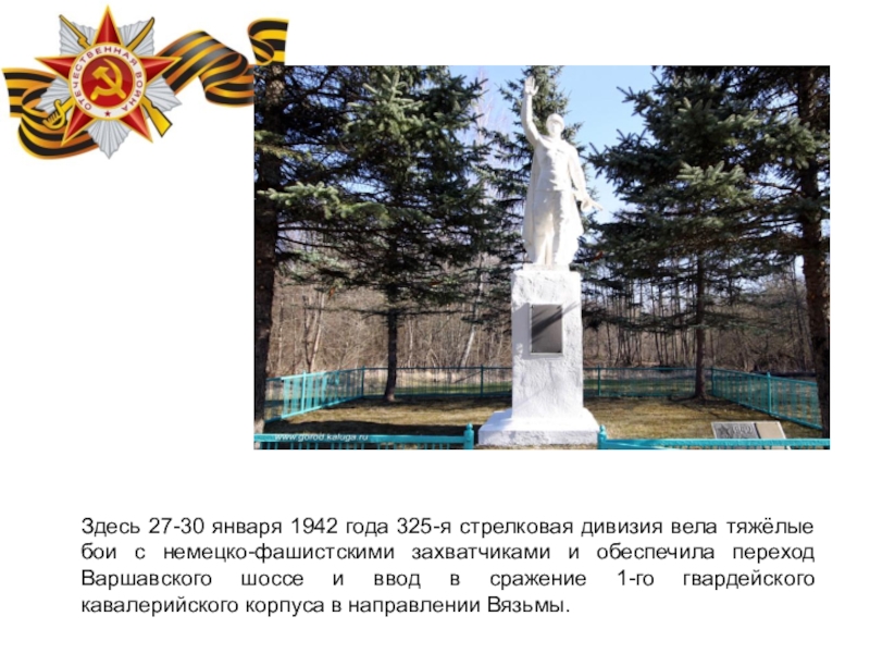 Слайд 30Здесь 27-30 января 1942 года 325-я стрелковая дивизия вела тяжёлые бои