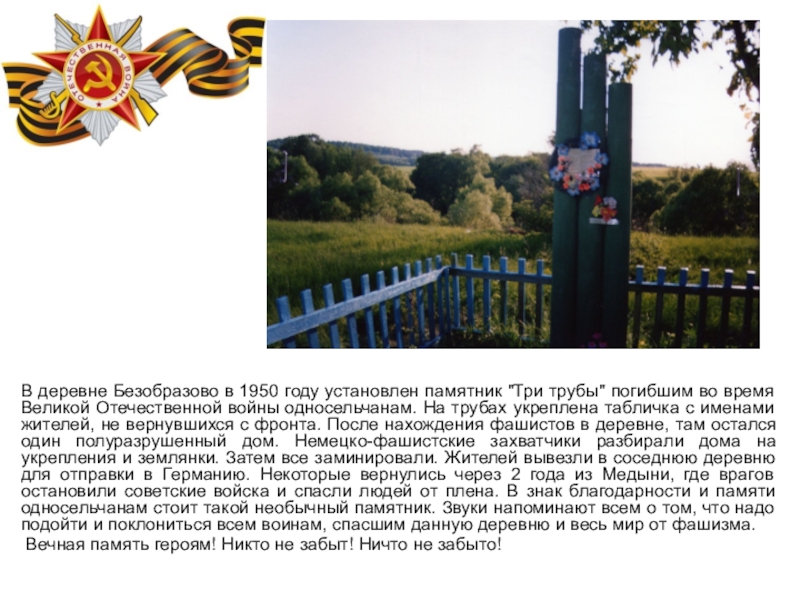 Слайд 91В деревне Безобразово в 1950 году установлен памятник "Три трубы" погибшим