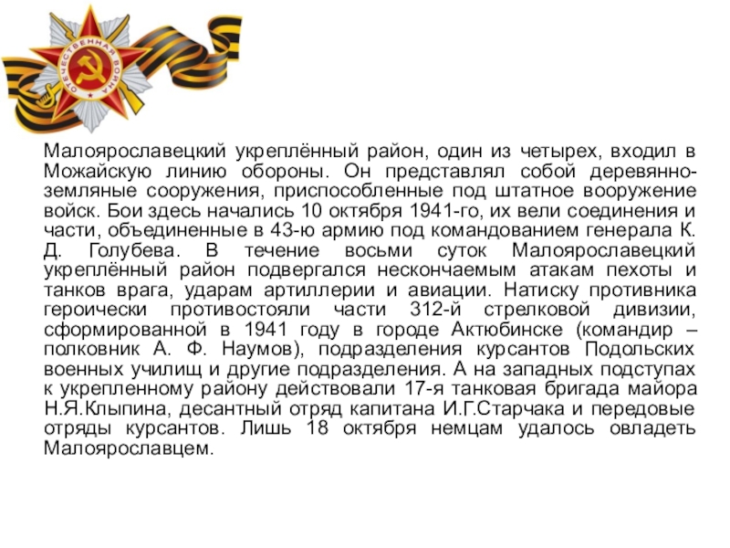 Слайд 78Малоярославецкий укреплённый район, один из четырех, входил в Можайскую линию обороны.