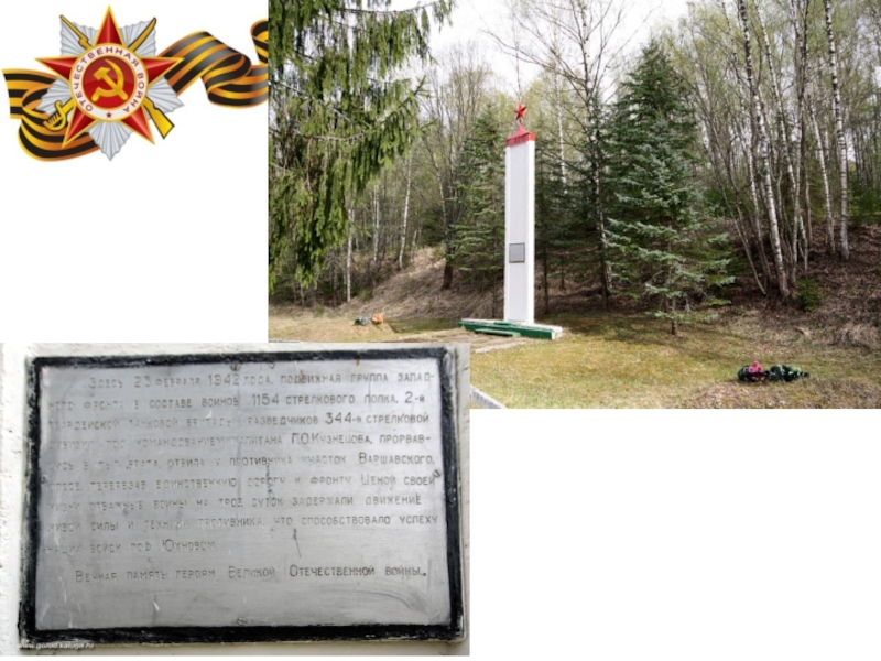 воинов 1154 стрелкового полка, 2-й гвардейской танковой бригады разведчиков 344-й стрелковой дивизии под командованием капитана Г.О.Кузнецова, прорвавшись в тыл врага, отбила у противника участок Варшавского шоссе, прервав единственную дорогу к фронту. Ценой своей жизни отважные воины на трое суток задержали движение живой силы и техники противника, что способствовало успеху наших войск под Юхновом.
