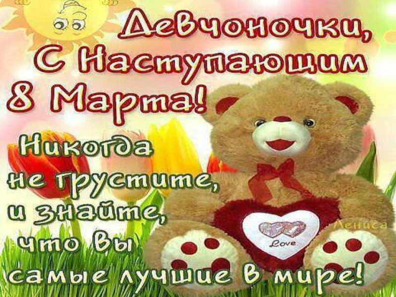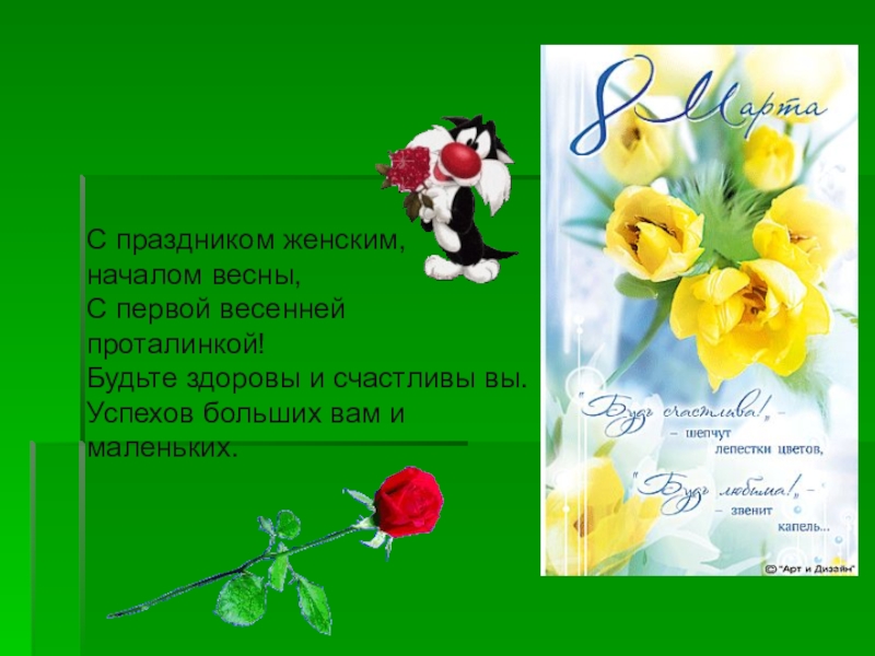 С праздником женским, началом весны,  С первой весенней проталинкой!  Будьте здоровы и счастливы вы.