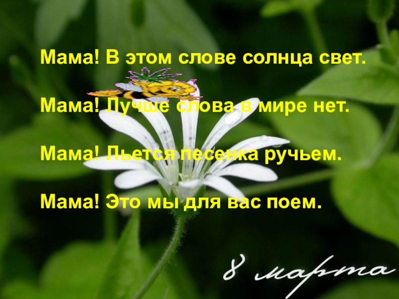 Мама! В этом слове солнца свет.Мама! Лучше слова в мире нет.Мама! Льется песенка ручьем.Мама! Это мы для