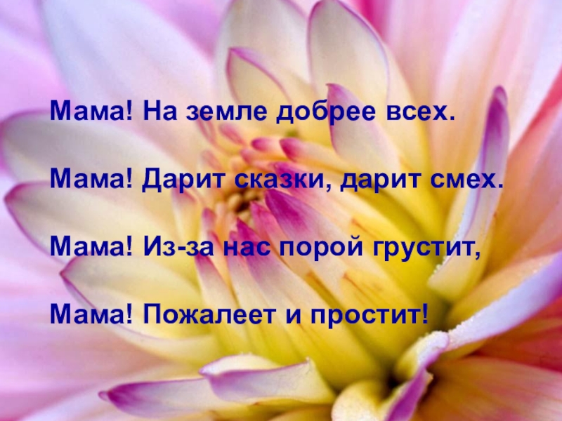 Мама! На земле добрее всех.Мама! Дарит сказки, дарит смех.Мама! Из-за нас порой грустит,Мама! Пожалеет и простит!