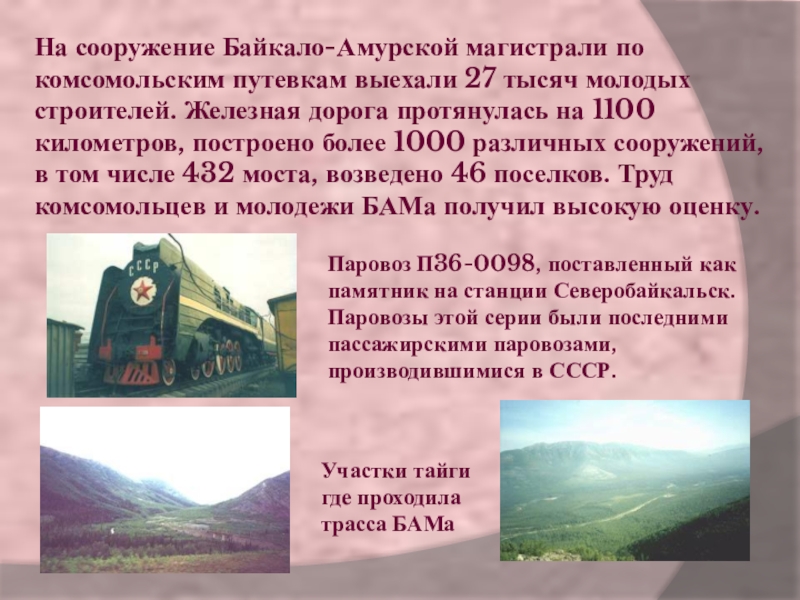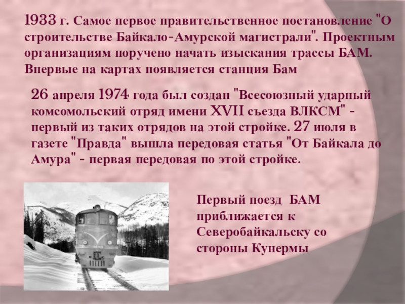 1933 г. Самое первое правительственное постановление "О строительстве Байкало-Амурской магистрали". Проектным организациям поручено начать изыскания трассы БАМ. Впервые на картах появляется станция Бам