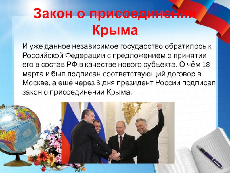обратилось к Российской Федерации с предложением о принятии его в состав РФ в качестве нового субъекта. О чём 18 марта и был подписан соответствующий договор в Москве, а ещё через 3 дня президент России подписал закон о присоединении Крыма.