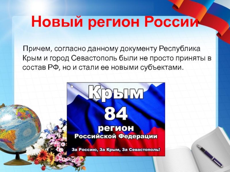 Новый регион России  Причем, согласно данному документу Республика Крым и город Севастополь были не просто приняты