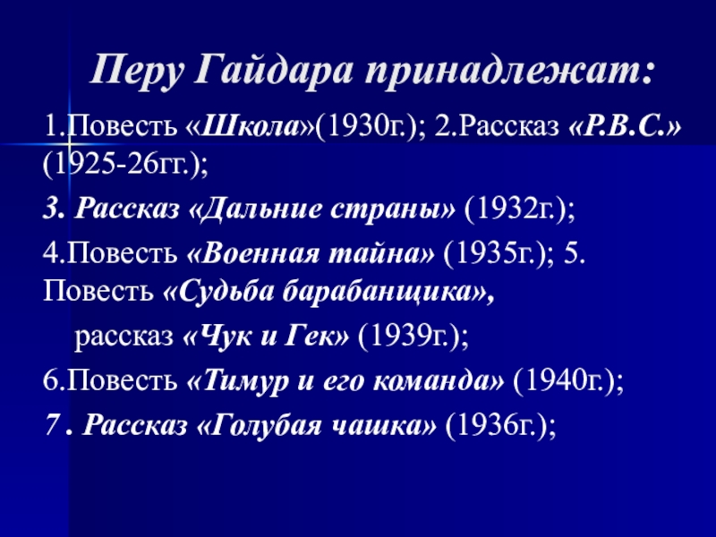 Перу Гайдара принадлежат:1.Повесть «Школа»(1930г.); 2.Рассказ «Р.В.С.»(1925-26гг.); 3. Рассказ «Дальние страны» (1932г.);4.Повесть «Военная тайна» (1935г.); 5.Повесть «Судьба барабанщика»,  рассказ «Чук и Гек» (1939г.); 6.Повесть «Тимур и