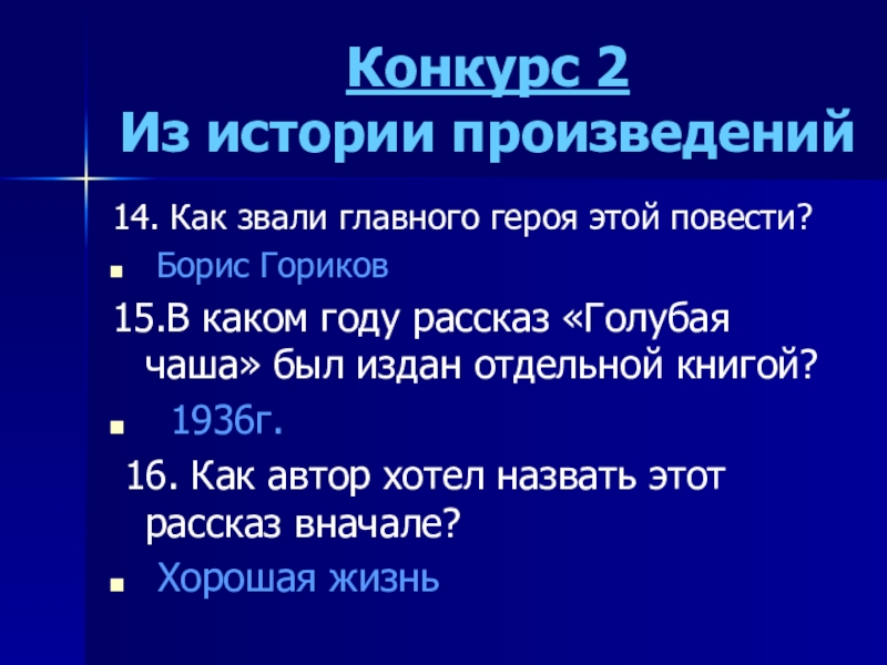 Конкурс 2 Из истории произведений14. Как звали главного героя этой повести? Борис Гориков15.В каком году рассказ «Голубая