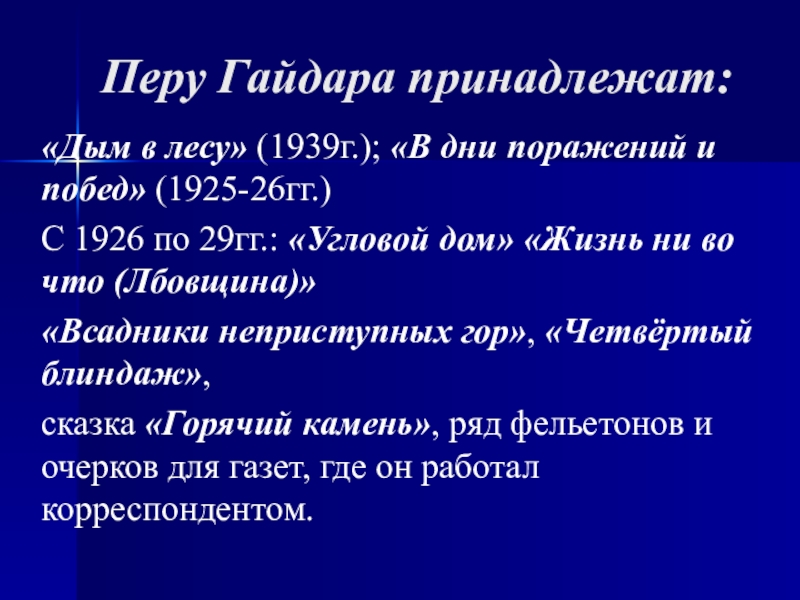Перу Гайдара принадлежат:«Дым в лесу» (1939г.); «В дни поражений и побед» (1925-26гг.)С 1926 по 29гг.: «Угловой дом» «Жизнь ни во что (Лбовщина)»«Всадники