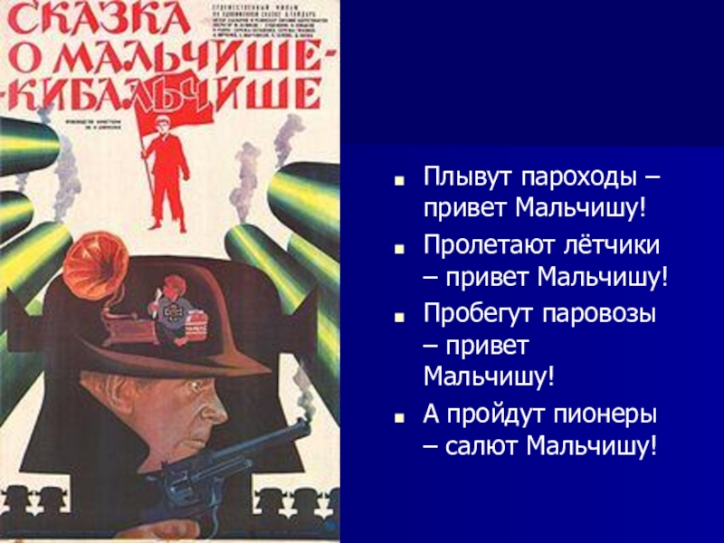 Плывут пароходы – привет Мальчишу!Пролетают лётчики – привет Мальчишу!Пробегут паровозы – привет Мальчишу!А пройдут пионеры – салют