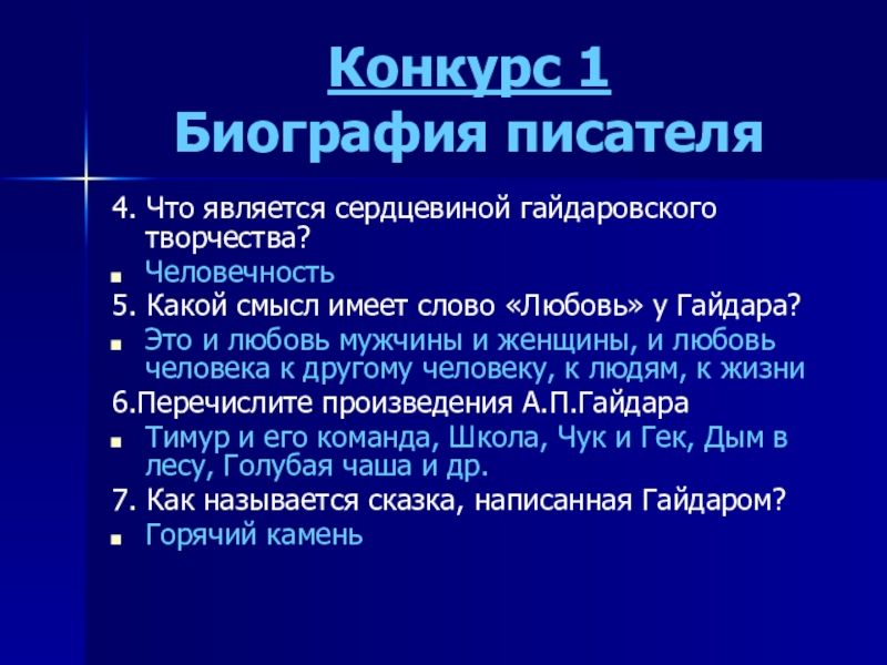 Конкурс 1 Биография писателя4. Что является сердцевиной гайдаровского творчества?Человечность5. Какой смысл имеет слово «Любовь» у Гайдара? Это