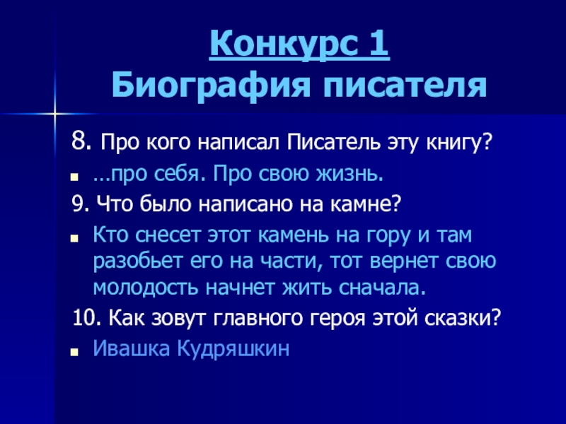 Конкурс 1 Биография писателя8. Про кого написал Писатель эту книгу? …про себя. Про свою жизнь.9. Что было