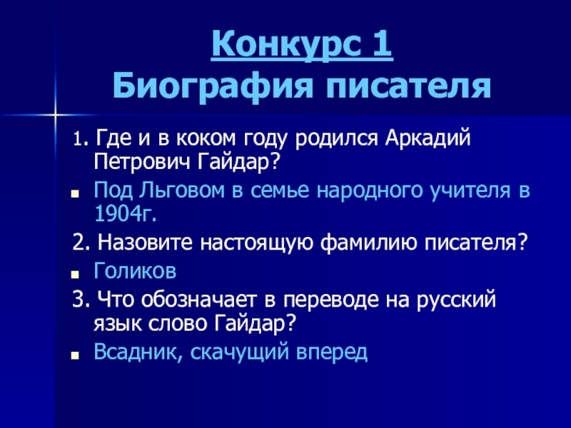 Конкурс 1 Биография писателя1. Где и в коком году родился Аркадий Петрович Гайдар?Под Льговом в семье народного