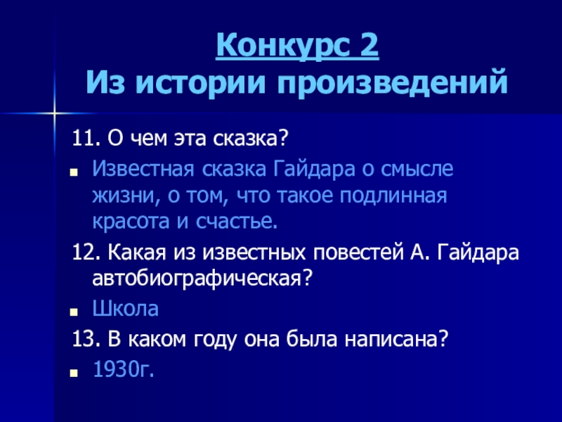 Конкурс 2 Из истории произведений11. О чем эта сказка?Известная сказка Гайдара о смысле жизни, о том, что