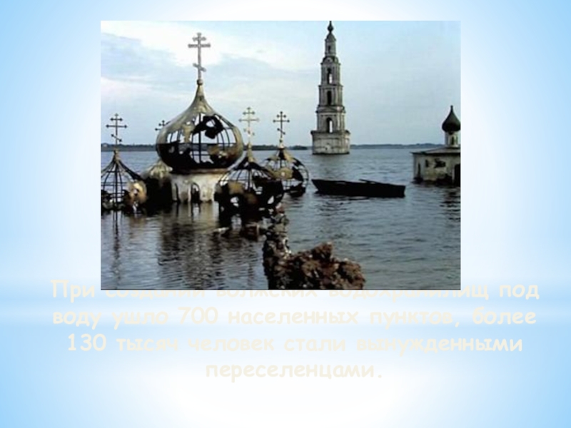Слайд 13При создании волжских водохранилищ под воду ушло 700 населенных пунктов, более