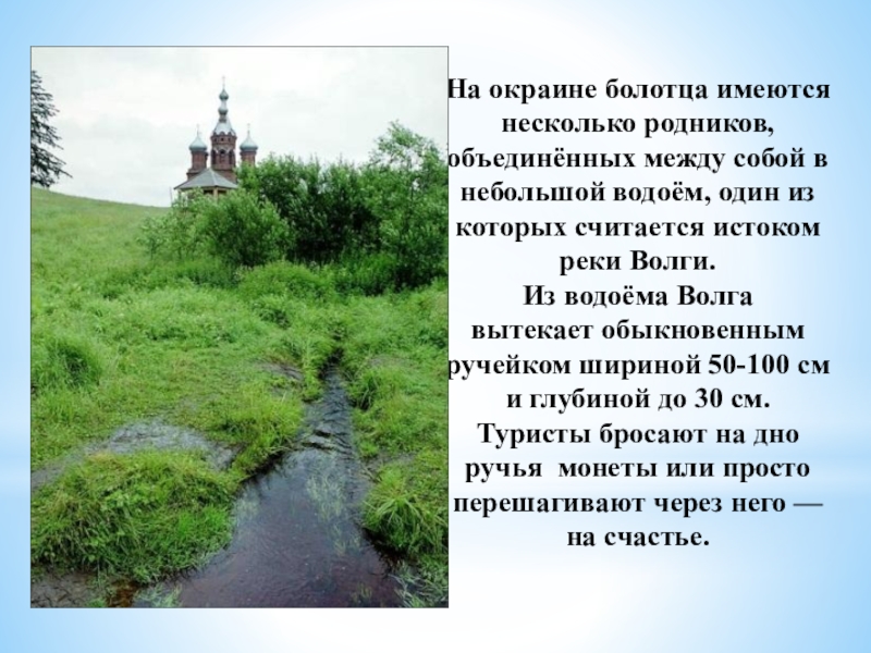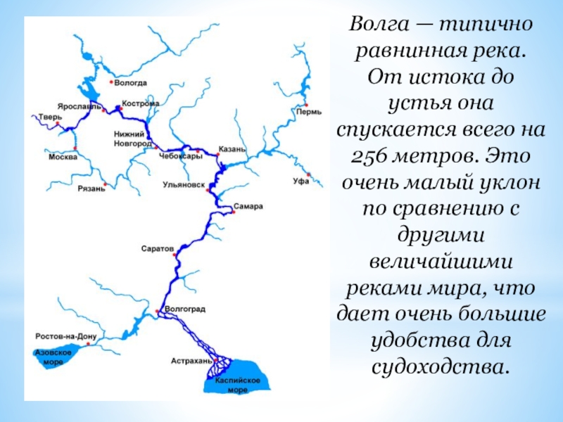 Слайд 8Волга — типично равнинная река. От истока до устья она спускается