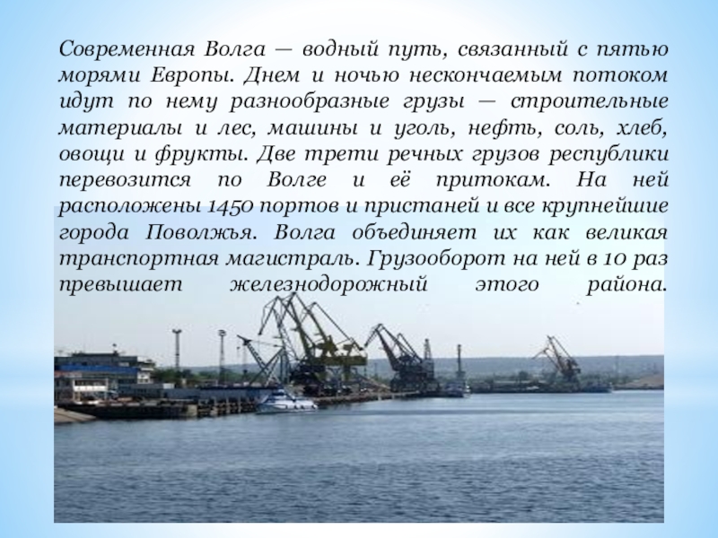 Слайд 22Современная Волга — водный путь, связанный с пятью морями Европы. Днем