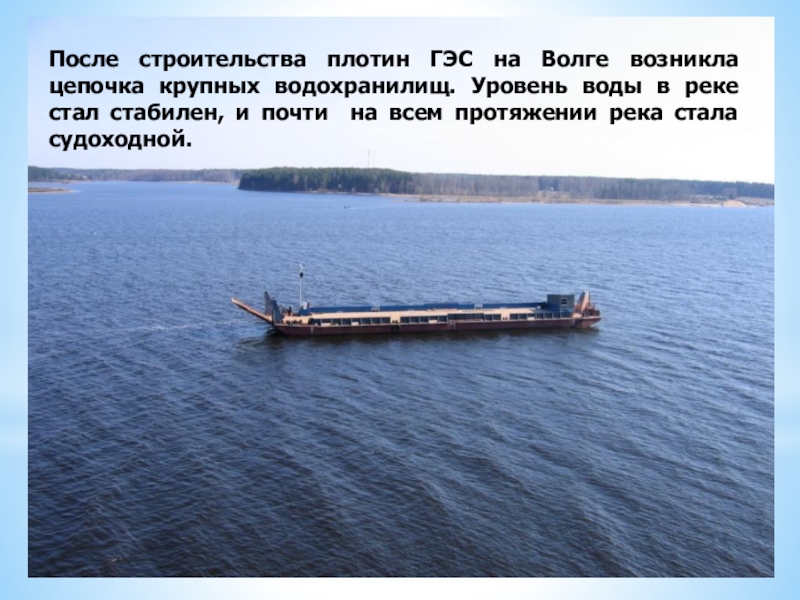 Слайд 12После строительства плотин ГЭС на Волге возникла цепочка крупных водохранилищ. Уровень