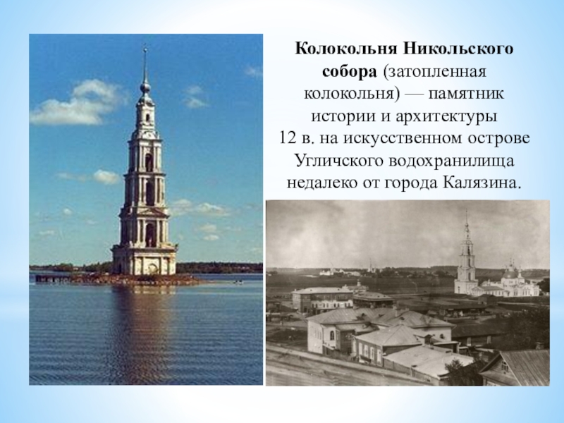 Слайд 14Колокольня Никольского собора (затопленная колокольня) — памятник истории и архитектуры