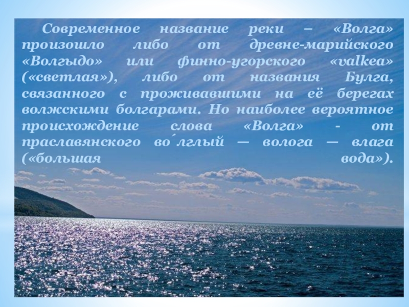 финно-угорского «valkea» («светлая»), либо от названия Булга, связанного с проживавшими на её берегах волжскими болгарами. Но наиболее вероятное происхождение слова «Волга» - от праславянского во́лглый — волога — влага («большая вода»).