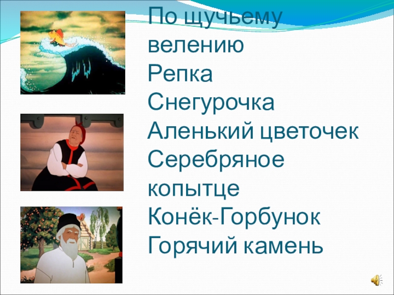 Слайд 7Колобок По щучьему велению Репка Снегурочка Аленький цветочек Серебряное копытце Конёк-Горбунок Горячий камень