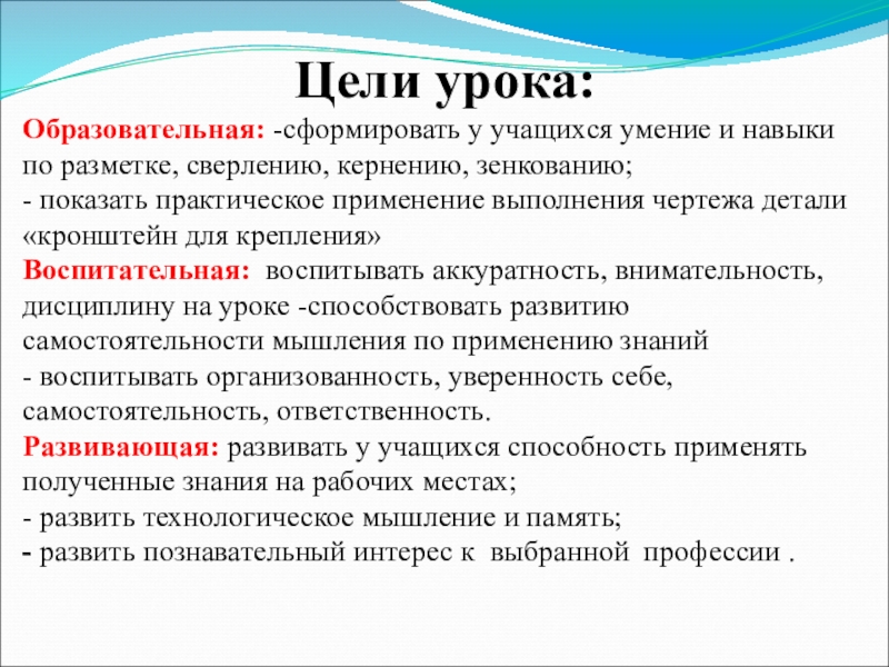 Цели урока:Образовательная: -сформировать у учащихся умение и навыки по разметке, сверлению, кернению, зенкованию;- показать практическое применение выполнения чертежа детали «кронштейн для крепления»Воспитательная: воспитывать аккуратность, внимательность, дисциплину на уроке -способствовать развитию самостоятельности мышления по применению знаний- воспитывать