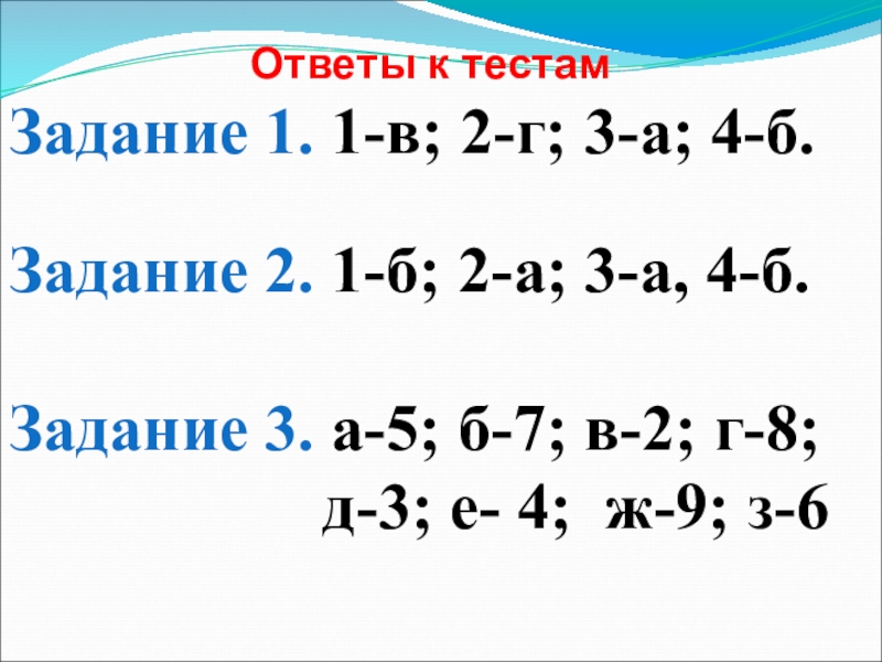 Ответы к тестамЗадание 1. 1-в; 2-г; 3-а; 4-б.Задание 2. 1-б; 2-а; 3-а, 4-б.Задание 3. а-5; б-7; в-2;