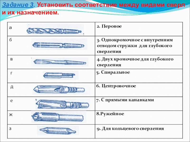 Задание 3. Установить соответствие между видами сверл и их назначением.а